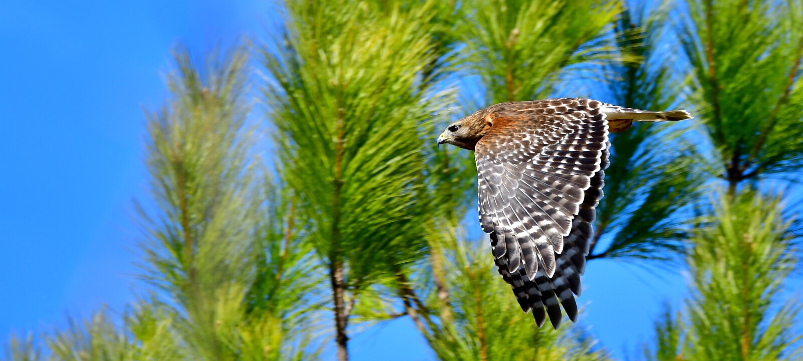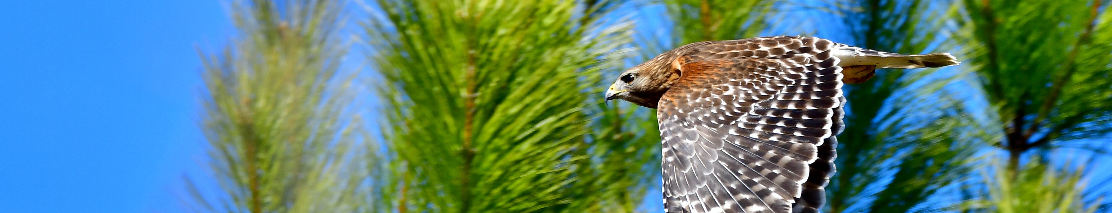Red-Shouldered Hawk Flying Past the Pine Trees